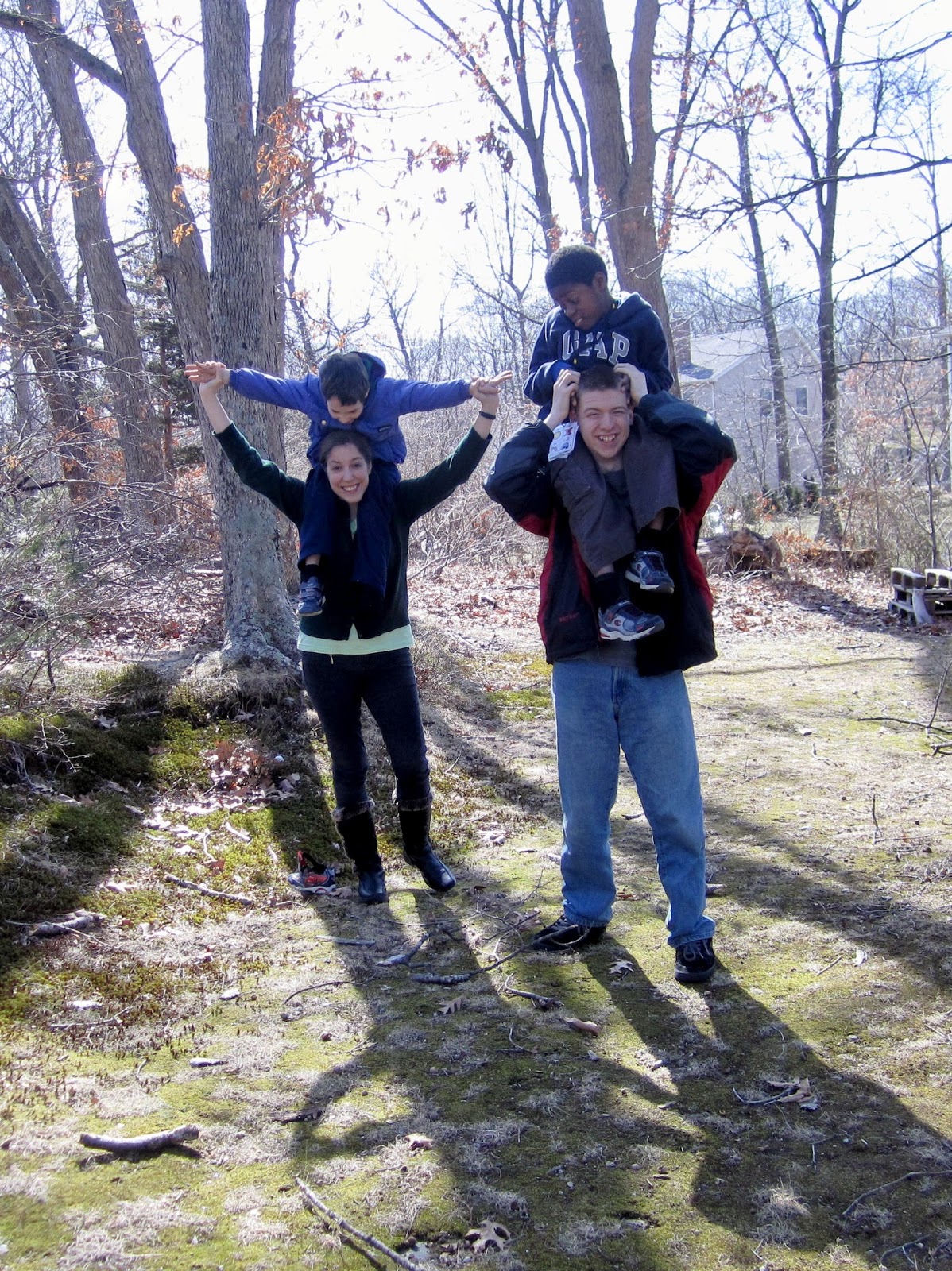 | Catherine carrying Philip and Warren carrying Nicholas (in our front yard at the time). |